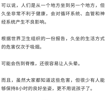 调查显示,人们平均每天有十几个小时是坐着的,因为要工作、学习,或者开车,甚至是在做一些娱乐活动的时候。